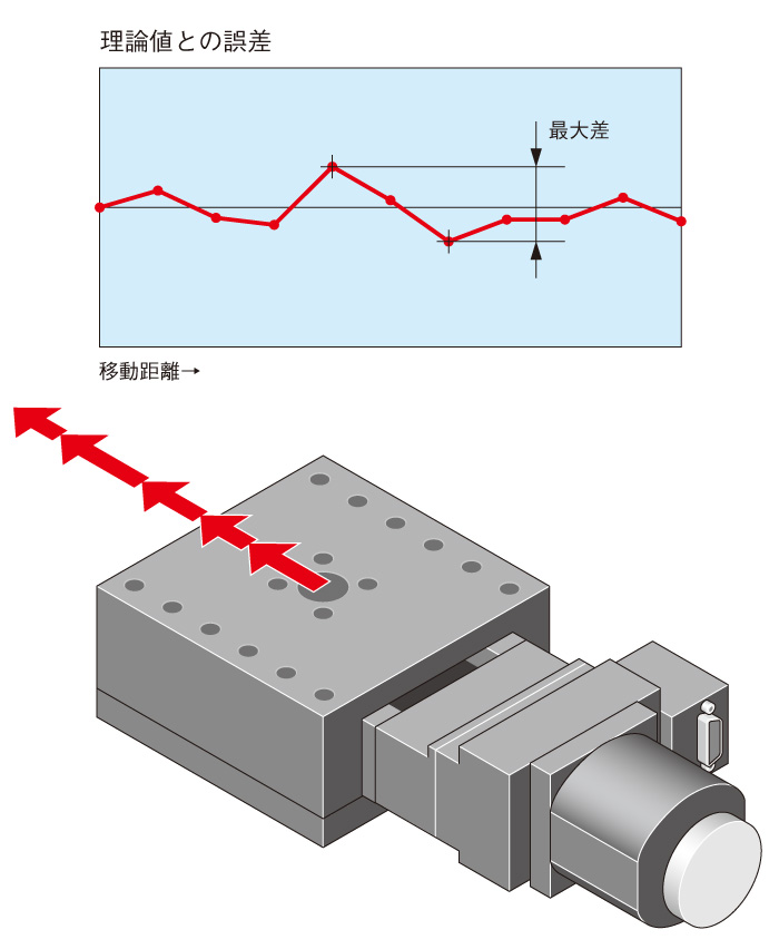 “从一个方向重复进行定位时目标位置与实际位置的偏差乖离的可容许的极限值。”从同一方向重复定位到任意1点7次,测量停止位置,测量测量值的最大差。测量在移动距离的中央、两端的位置上进行,在求出的差的最大值的1/2上加上±,作为“重复精度”。