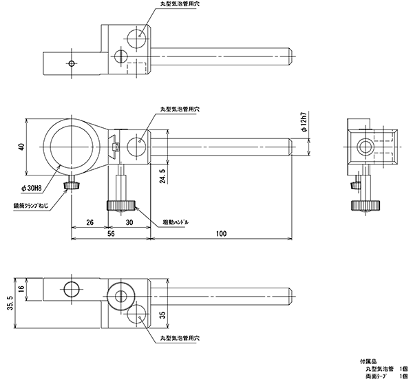 レベル(丸形水準器)が1ケ付属しています、作動距離の長いレンズを使用したときに光軸を水平に合わせるのに便利です。