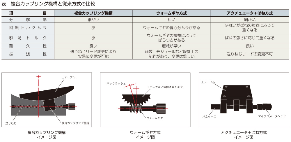 ウォームホイールとウォームギヤによる一般的な駆動機構です。傾斜ステージでは上テーブルの一部をウォームホイール形状にし、ウォームギヤで駆動させています。この機構は、一定量のバックラッシュを持たせるか、十分なラッピング調整を行わないと、動作時にウォームギヤが重くなったり、ウォームギヤの偏心により回転トルクムラが出ることがありました。