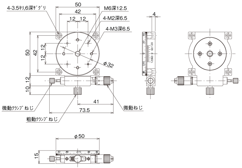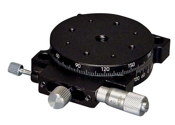 You can rotate the table 360 degrees by hand. Fine movement is performed using a micrometer head on the coarse movement clamp.