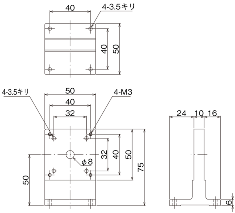 The T-shaped bracket can be installed on either the front or back side. Also, since the center of the load does not extend outside the outer shape of the bracket, there is no large unbalanced load.