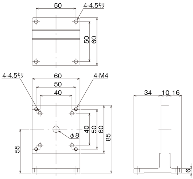 The T-shaped bracket can be installed on either the front or back side. Also, since the center of the load does not extend outside the outer shape of the bracket, there is no large unbalanced load.